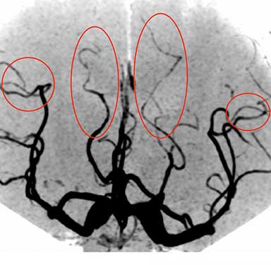 可逆性脳血管攣縮症候群(RCVS)という、脳血管の変化を伴う疾患があります。雷鳴頭痛といわれる急な頭痛で始まり、断続的に激しい痛みを繰り返す疾患です。MRA検査で血管攣縮(血管が縮む現象)を見つける事で診断が付きます。この血管攣縮の場所は、血管の先端部から始まり次第に中心部へ移動するとされているため、初期段階では先端部の細い血管の変化が見えにくい場合があります。
