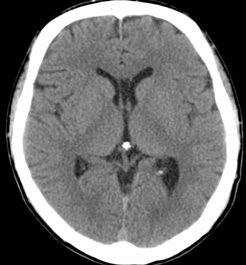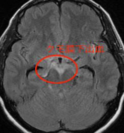 脳底部のくも膜下腔という部分に白く映っているのは血液で、くも膜下出血を起こしている状態です。ここは本来髄液という水の流れている場所で、正常では黒く写ります。