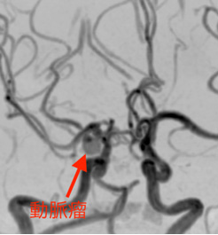 くも膜下出血の原因となる動脈瘤(血管のコブ)や動脈解離(血管の壁が裂ける状態)が分かります。この例では、右の内頚動脈という血管に脳動脈瘤を認めます。通常のCTでは、脳動脈瘤は分かりません。