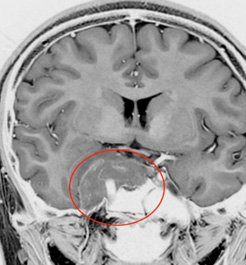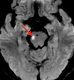 脳の血管がつまる脳梗塞は、発症してすぐにはCTで写りません。MRIでも、この検査法でなければ写らない時期があります。脳梗塞を疑い、MRIで拡散強調画像を撮って初めて、発症したばかりの脳梗塞を発見することができるのです。この例では、脳幹というCTでは写りにくい場所に、数時間前に発症したばかりの脳梗塞(白く光っている場所)があります。