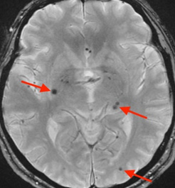 この例では、複数の微小脳出血(細動脈というきわめて細い血管が破綻したもの)がとらえられています。CTでは、このような微小脳出血はほとんど分かりません。